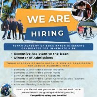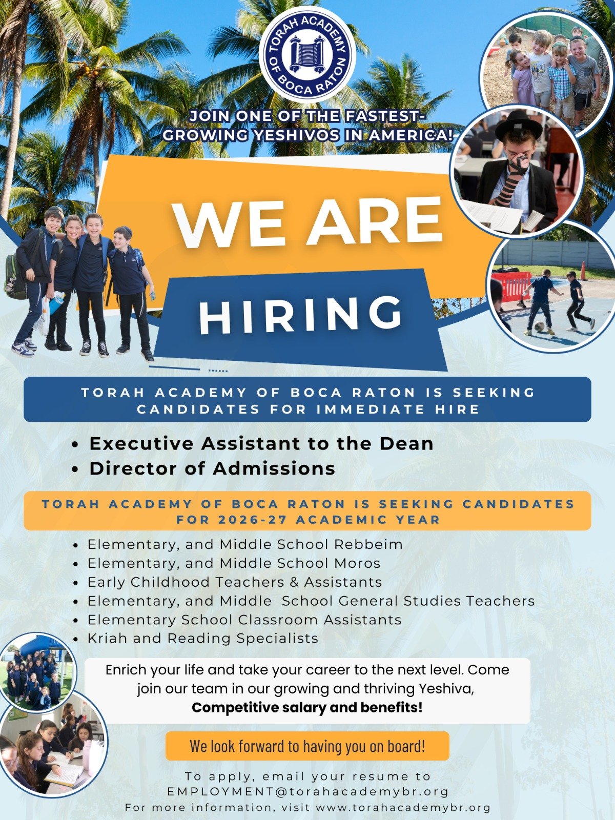 Torah Academy of Boca Raton is seeking the following for immediate hire!