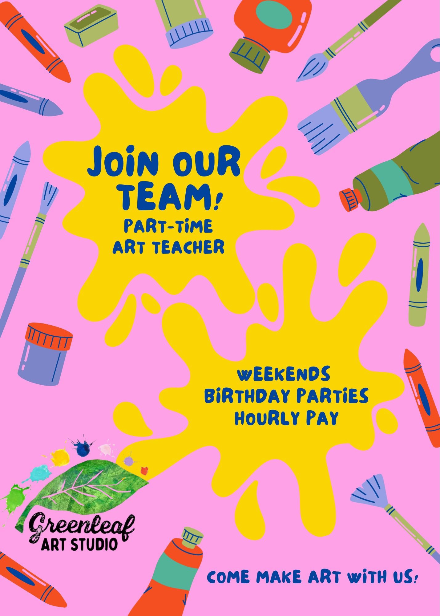 Greenleaf Art Studio is looking for a part-time Art Guide to join us on weekends and for birthday events. You’ll lead sensory-rich, open-ended art classes for children and Parent & Me sessions for our littlest makers.
